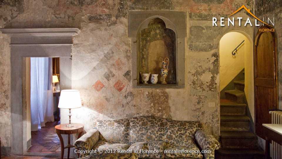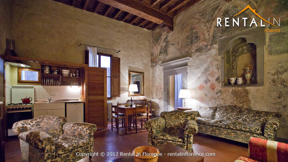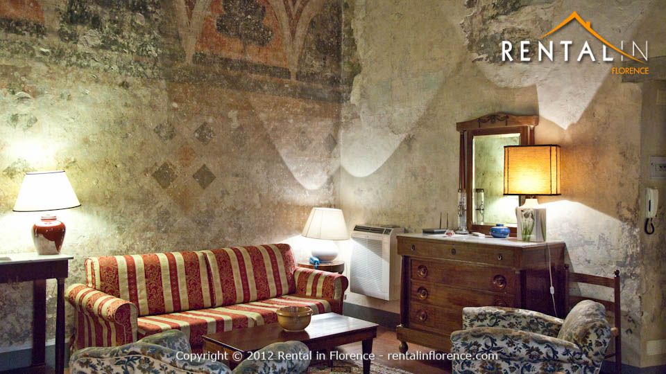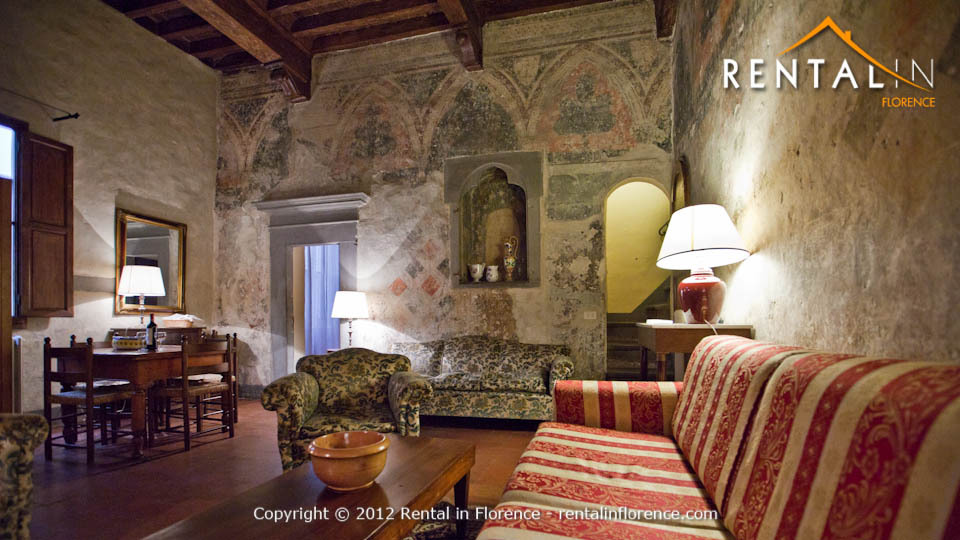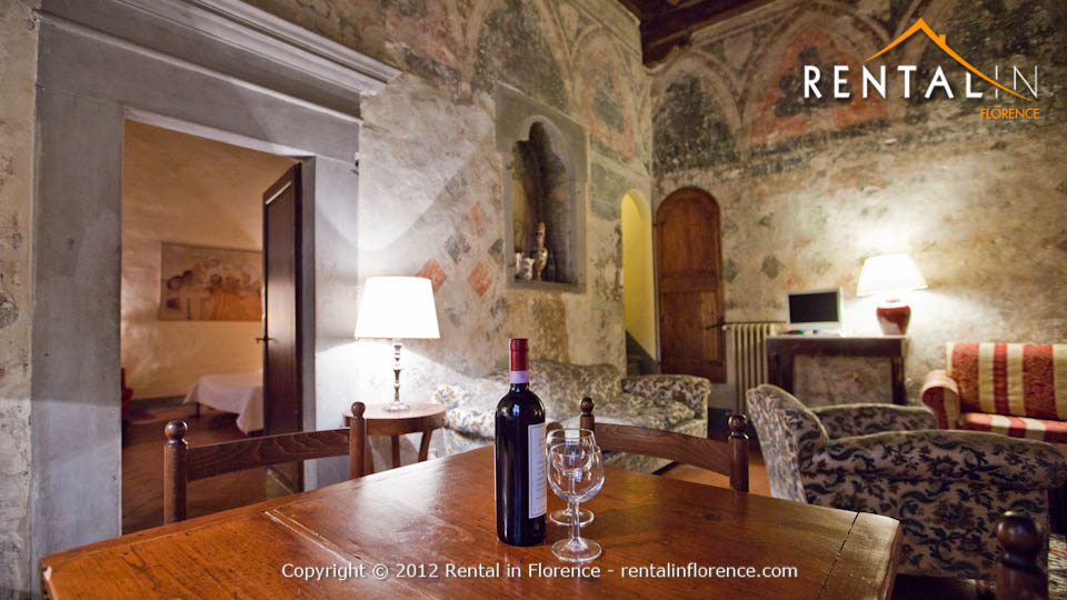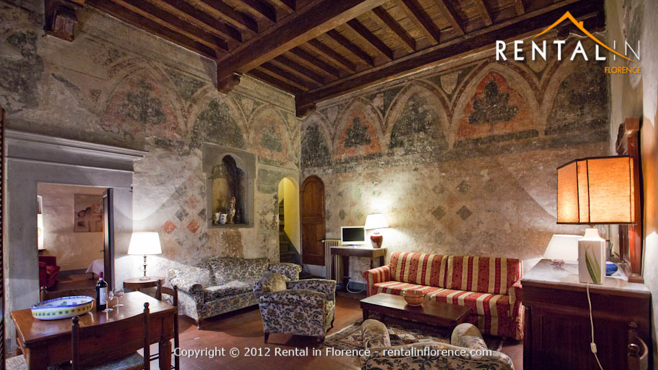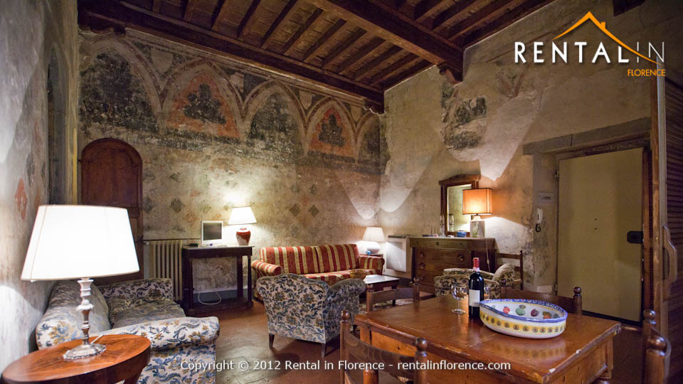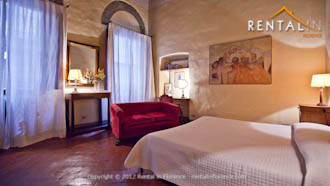 Splendide appartement de style médiéval, situé au premier étage d'un immeuble de l’An 1300 sans ascenseur. Au rez-de-chaussée on trouve un très beau salon avec des murs peints avec fresques, divan lit matrimoniale, tv flat, angle cuisine, une grande chambre matrimoniale et salle de bain avec baignoire. Au niveau supérieur on accède à une chambre avec des lits séparés et salle de bain avec douche. Équipé de tous conforts : Air conditionné, chauffage autonome, Wifi gratuit, téléphone, cuisine complète de vaisselles, four, réfrigérateur, cafetière italienne, théière, grille-pain, équipement pour le nettoyage de la maison, machine à laver, étendoir, fer et table à repasser. Mobilier d'antiquité d'excellente qualité, tapisseries et peintures à fresques complètent ce très élégant appartement, Unique parmi nos propositions.